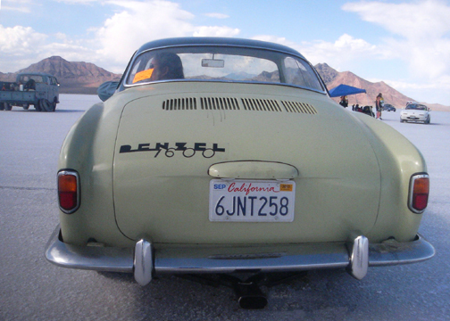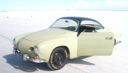 So, we got our butts in gear and put together the 1959 Karmann Ghia pictured at right. We decided to power it with the legendary Denzel engine, but at the time there were only three other known running examples in the world, and we didn't have all the pieces. It was very difficult and we made it to the Bonneville Salt Flats just barely in the nick of time, and proceeded to set new records straight away. And so it came to pass that at 50 years of age, this Ghia set a world-record and at least seven "firsts."