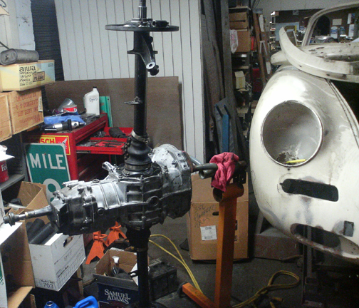 This is where the primary assembly took place, next to a Porsche 356 B Cabriolet (1600S) that's in the process of restoration. This photo was taken after everything but the brake assemblies had been installed. It actually took about 4 core transaxles from three different decades of production for us to select all the right parts.