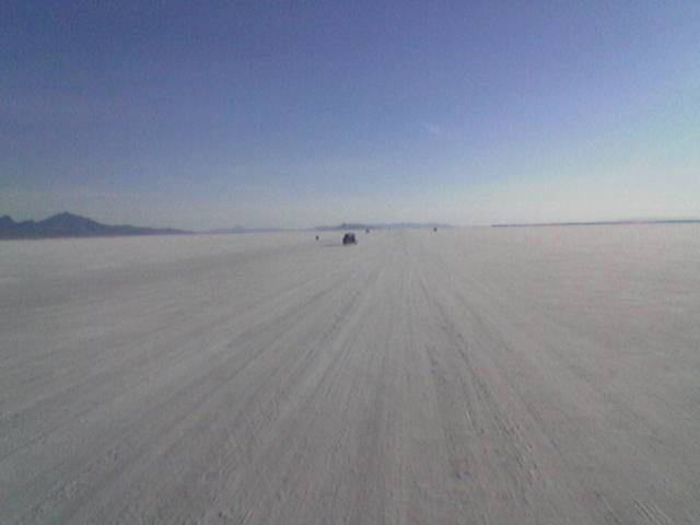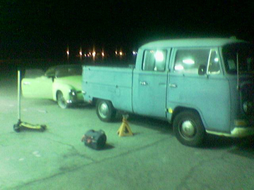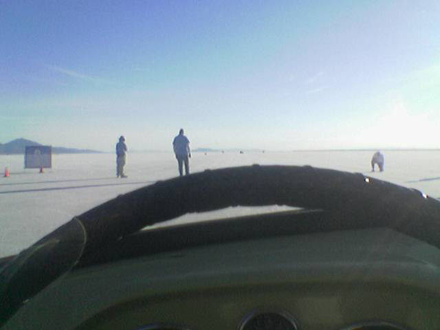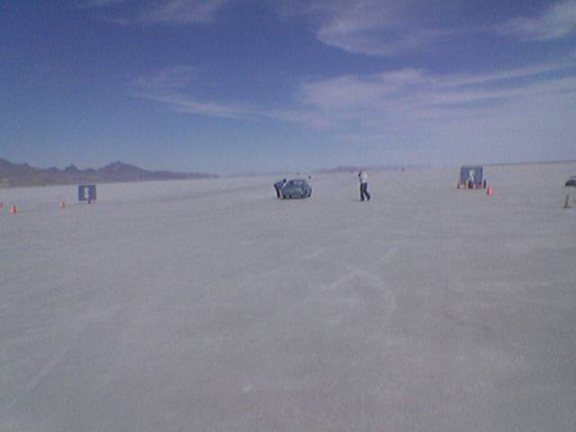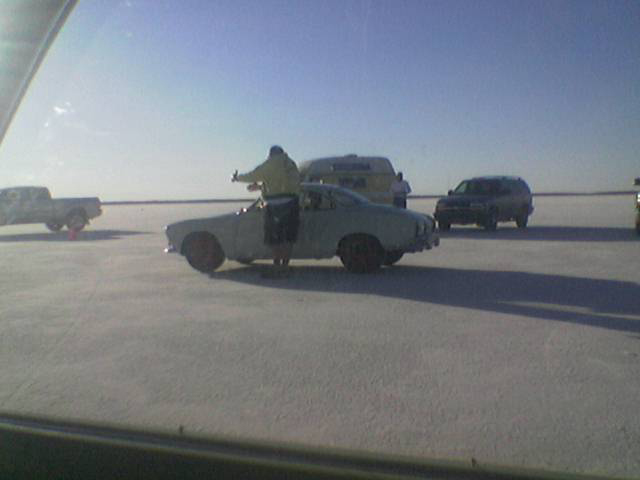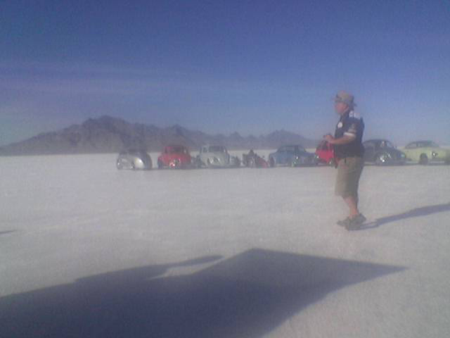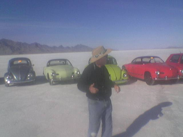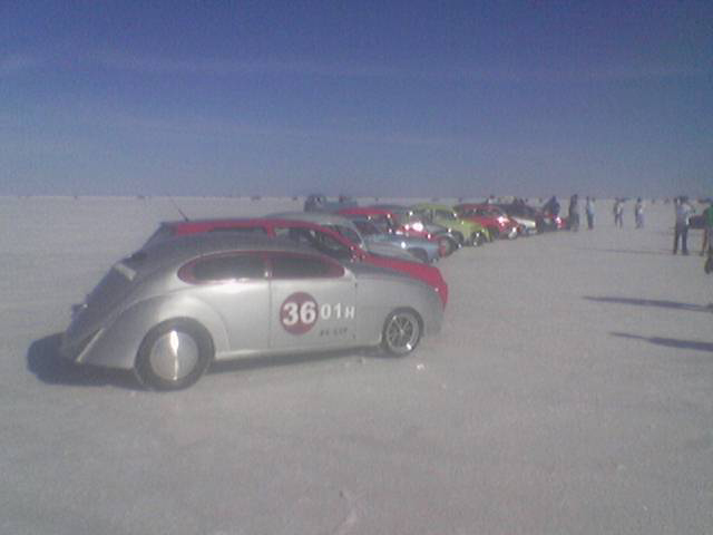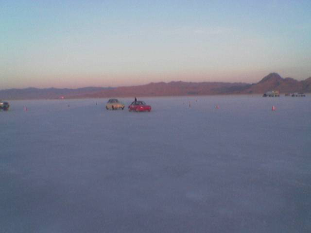 As the first V-Dubber on the salt, well before dawn, we picked out the best spot for the pit area for (hopefully) all the VWers - and we got as much space for us as we could! Here it was at setup - that's Babe, our Blue Ox pickup truck and the end of the tarp in the distance with those tires are what we put out to mark the end of the space we were reserving.