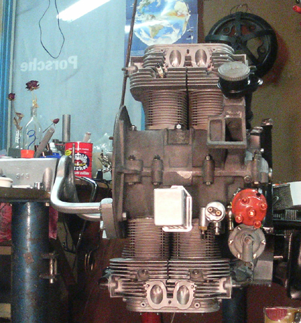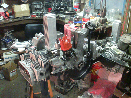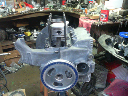 On right, the bottom end has been completed and the heads have been attached only as a means of retaining the cylinders - they, themselves had yet to be bolted on when this picture was taken.