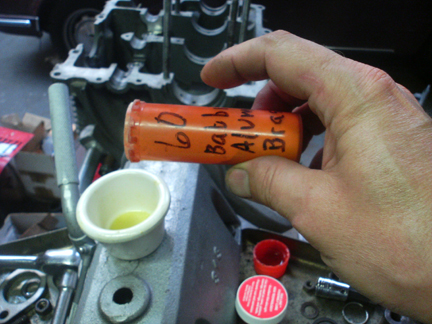 To solve the camshaft fit problem, we mounted up the cam in the lathe and gently trimmed the OD of the bearing journals to 13.98mm, and then we lapped the case using a special lapping compound designed specifically for lapping aluminum - it will not continue to cut and it will not embed! To use it, you combine it with a little oil, assemble the parts, and then cause them to rub together, thus lapping the aluminum part(s). Mixing of the lapping compound with oil is illustrated in the image below, right.