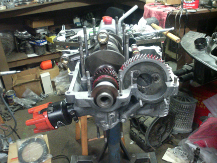 We mocked up the assembly many dozens of times, and when we thought we finally had it, we found that our new camshaft bound up in its bore in the crankcase! In the image below left, we see the open crankcase just prior to final assembly. As it went together, we ensured that the main bearings did not bind but we did not suspect that the cam bearings would! We checked and both the cam and the case were "at fault." Shockingly, the case bore for the cam was smaller than new specification! And, surprisingly, the new camshaft was also larger than it should have been!