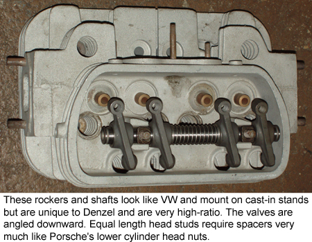 In the shot below left, you can see the spacing of the rockers, and if you look closely, below right, you can see the spacers we made to position the rockers properly. You can also see how the equal length head studs work on a Denzel - at least when installed. The usual Denzel setup has studs that stick through with standard nuts on top of spacers that look very much like these head bolts, and they do provide an identical-height-grip even without identical length studs. The setup we are using, however, has true equal length head studs to help guarantee no loss of cylinder to head sealing and reduce the risk of warpage under heavy load, heavy heat conditions.