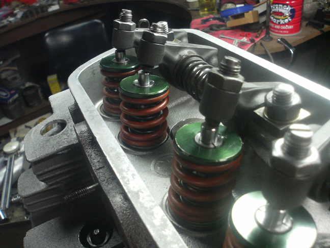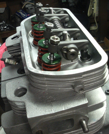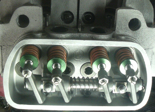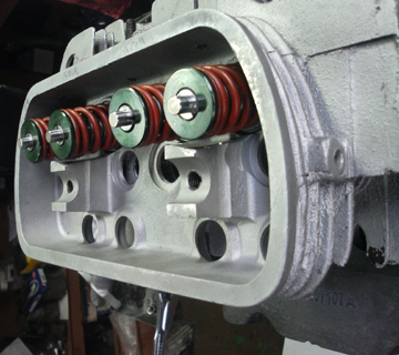 In this shot, look very closely and you can see the dual springs, the spring seat and you get a nice close-up of half of the valve keepers that we actually made just for this engine. The whole setup here is our engineering with the exception of the valves - straight Denzel copies made of modern materials - and the inner valve springs - they are stock Denzel. A few parts, like the outer springs and green retainers, we got from modern applications as off the shelf parts for something else.