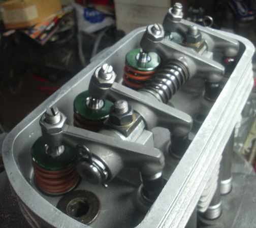 Here's a close-up of the valve assembly. If you look closely, you'll see the dual spring setup. What a pain! And... An image with the head mounted to the engine, rockers fitted and pushrods installed. This was during the pushrod length check - we'll have to make new pushrods!