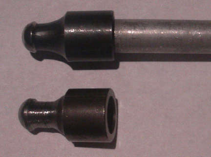 Something of vital interest but often overlooked are the pushrods. Here are some images that show the detail. At top is a late Denzel pushrod. Below is an image of two tips, the upper, with tube, is the late-type stock Denzel, and the lone piece is a tip we made to server the same purpose. Note the heavy undercutting of the tip - this is required for high-lift camshaft applications. Yes, we could have made a more precision tip, but we were running out of time and made this one from an available donor using a lathe with grinding stone, "by hand." (Note that someone has gone to great expense to reproduce the Denzel pushrod tip, however, unfortunately, they did not realize that the high-lift cams require the under-cut, and so their tips will require this same modification for high-lift camshaft applications!)