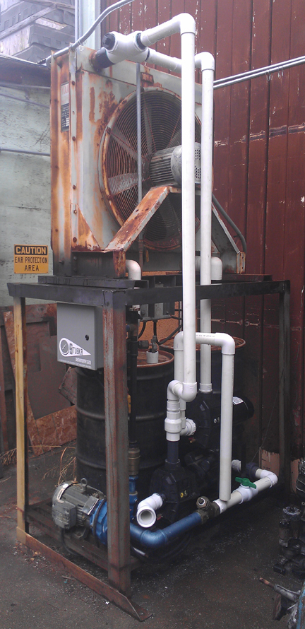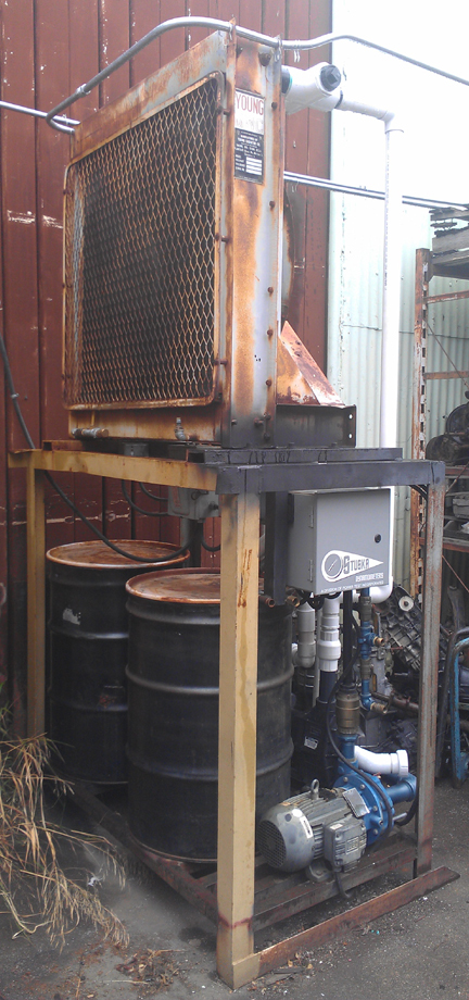 The radiator stand supports a 1200 continuous horsepower radiator which is roughly four feet square and 10" thick, and cooled via a ducted 5hp fan. Below this is a section where electrical connections are made and below this, three water pumps and two 55 gallon drums provide the water services the brake requires.