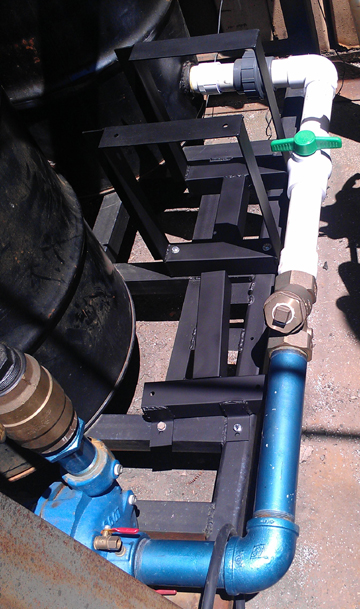 AT RIGHT: This image shows the water system in an earlier configuration than present but clearly shows the two 55 gallon drums are joined with 3" union at their base, the right one of which feeds the primary pump (in blue, lower left) via a 2" pipe (blue and white at bottom). The white pipe feeding the left drum is from the 1200 continuous hp radiator situated directly above the drums, so that is return water from the brake. The black pipe running vertically with a 90 elbow in the foreground left has been removed. The bronze fitting on the lower left is a check-valve on the primary pumps discharge, and the flow continues upward to a vacuum breaker (bronze fitting with chrome cap). Just below that is a T fitting with the original load valve repurposed as a controllable return-to-tank feature which permits the system to provide very low loading at low RPM when running-in small engines (like, say, 36hp VW) where the pump's minimum capacity may be too great. At the bottom of the image is the system's original return pump, since replaced with the new self-priming return pump. Also just barely visible at the bottom is the primary pump's feed, with filter (just right of center), and valve (green tip of wich is at the extreme lower right).