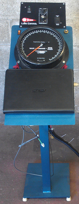 AT RIGHT: The Control Stand, in service. The dial in the center is the torque dial - and an original vintage component of this Dynamometer. The lit switch on the left is the ignition switch. The button opposite (on the right) is for the starter. The upper unit is the Digital Load Control unit and the computer screen below the dial is display for the Digital Data Collection system.