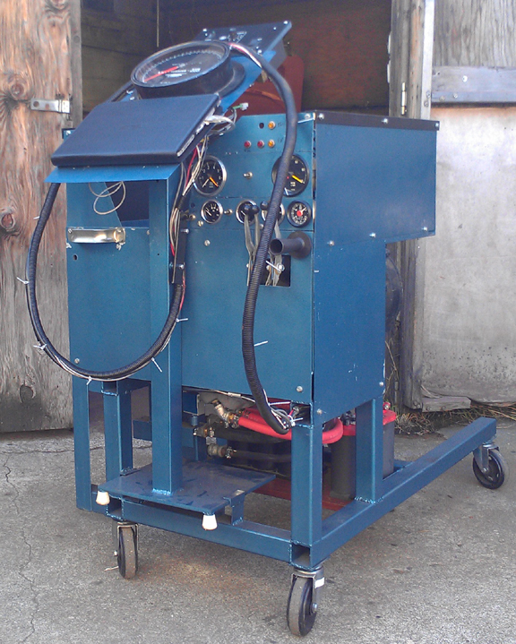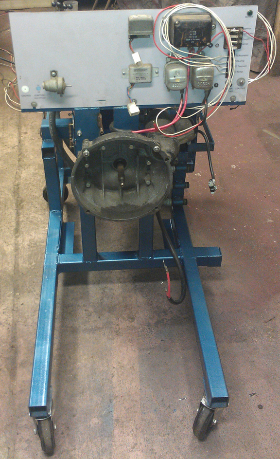 our Dynamometer:AT RIGHT: Test Stand with Control Stand stowed. This side has the analogue gauges, including two different tachometers (different ranges, one covering 4, 6, and 8 cylinder), two different oil pressure gauges (different ranges), an oil temp gauge, and hobbs meter. There's a coil voltage selection switch, various warning lamps, and four throttles (on right, below the gauges). On the Control Stand but not visible is the digital data collection system, though its display computer is visible below the large dial. Here, the Control Stand is undergoing rewiring.