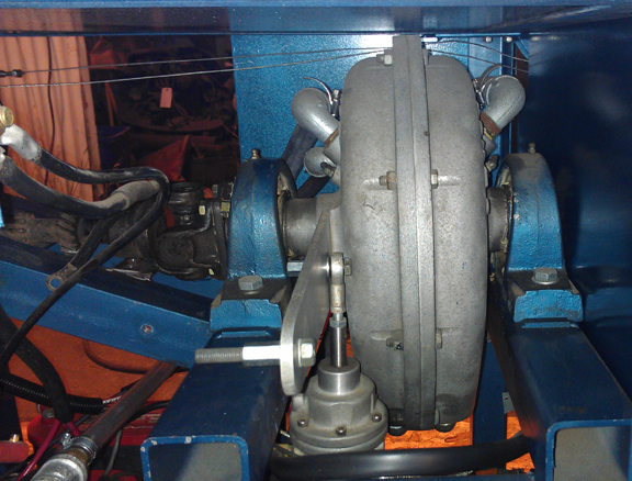 AT RIGHT: Here's the brake in a side-on view. It's mounted between two trunions (AKA "pillow blocks") that permit it to pivot freely. The torque arm comes toward the camera with the torque cylinder mounted on the inner fastening point via a heims joint so it pivots freely. The inner position permits better accuracy at lower torque values. The outer mount on the torque arm is used for calibration purposes. A coupling nut is used on both mounts so a level can be used to determine when the torque arm is level for calibration purposes. Above center, on both right and left sides in this image, the two 3/4" water inlets enter the brake at a 45 degree angle, and the vent is visible just below the inlet on the left. Several throttle cables - with no tension - are visible routed above the brake.
