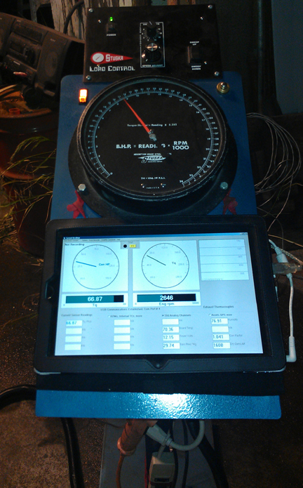 AT RIGHT: The dynamometer's Control Stand. The Stuska Digital Load Controller is at the top. Next is the old-school torque gauge, with starter on right, and lighted ignition switch on left. The next one down is the tablet computer that serves as a display for the Digital Data Collection system - the cover flips underneath to expose the display. A removeable keyboard tray can be installed below the tablet. Note this image was taken during reconfiguration of the wiring, hence the dangling wires.