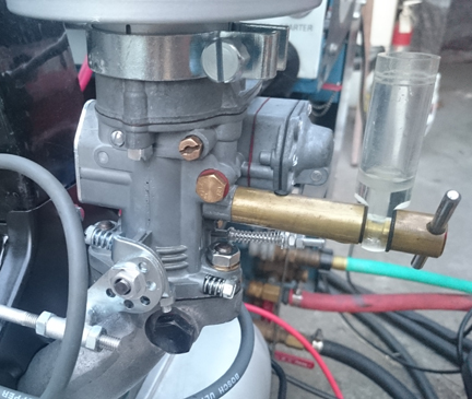 AT RIGHT: Checking the height of the fuel in the float bowl. The sight-glass is universal to all Solex carburetors (that we know of) as it threads in where the main jet carrier normally goes. Here it is installed in the right-hand, recently rebuilt PBIC carburetor.
