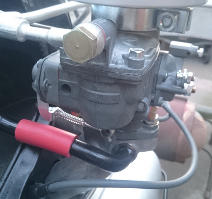 ABOVE LEFT AND RIGHT: The left-hand carburetor is shown. In the left image, it can be seen that the sight-glass used for checking float height cannot be fitted to this side when the carburetor is installed on an engine. However, because the two carburetors are identical in most respects, with identical floats and related parts, any adjustment needed by the one is also needed by the other. Note also that Porsche normally only fitted the starter to the left hand carburetor, in part because two aren't normally necessary, and also because of clearance issues with the fan shroud on the opposite side, like the sight-glass. ...Additionally, here can be seen, in the right image, the manifold connection. The red tubing is normally retained with small key straps, just like are used on solid axle boots, only smaller. Here, they were left off because this is not the final assembly of this engine and the tubing was sealing well without them - they are being provided (new, of course) to the buyer.
