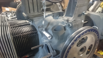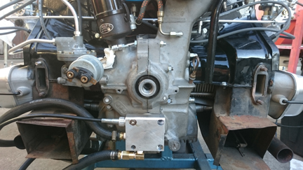 BELOW RIGHT AND LEFT: The buyer also opted for our new full-flow filter system which does NOT require modification of the crankcase. Here it is, installed and hooked-up to both the full-flow filtration AND a mechanical tachometer! In the image at right, the pully shroud is mounted to ensure clearance, and the engine is at that point running!