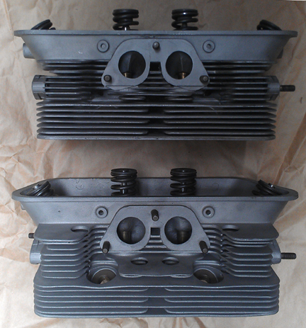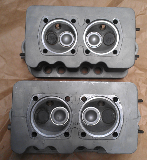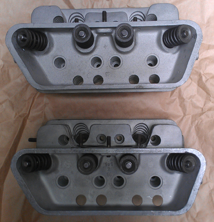 HeadsThese heads are in great condition - I found no cracks or broken fins - but it does not appear they were actually originally paired together. The guides were of the 10mm variety, but they still had bronze seats in them. (Bronze seals well but wears out quickly. Also, bronze can't take the unleaded fuels we have today.)