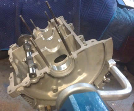 ABOVE LEFT AND RIGHT: The crankcase is now ready for assembly with the dowel pins and middle main bearing installed. The camshaft has been laid in place but the gear hasn't been installed yet. Note the coloration differences in these images - the difference is primarily the effect of lighting, however the one on the left is from the first assembly (Dow 19 process) and the one on right is from the second ("Alodine").