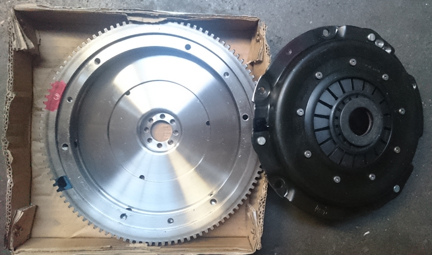 BELOW LEFT AND RIGHT: A new 200mm flywheel was chosen, with 6v ring gear and VW depth clutch, mated to a new, heavy-duty diaphram type clutch. These are balanced together (see the lightening drillings, upper right parimeter of the pressure plate), and then attached via a brand new gland-nut, pictured left.