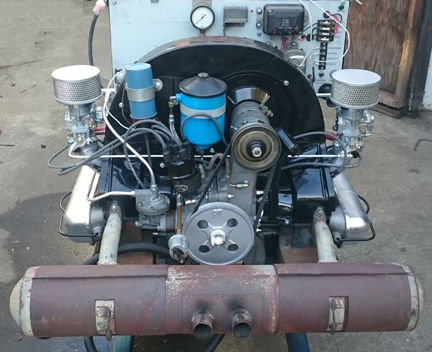 BELOW RIGHT AND LEFT: The engine on the dynamometer, after mounting the exhaust system but before attaching the various wiring required for running on the dyno. The muffler is from a "C" series. The crankshaft pull is "the large OT pulley," correct for the 2 piece case era, but the generator and generator pulley are from a younger engine and, notably, we tried a 3 piece case style generator pulley but had no belt that would work with it, so it was swapped for a 36hp VW unit for the run-in process because it, combined with the OT pulley, only requires a standard "6v VW" fan belt which was on hand. Note also an oil pressure sending unit has been mounted which passes to the left of the crankshaft pully and above the muffler.
