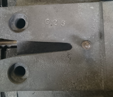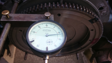 BELOW RIGHT AND LEFT: The flywheel end play is set to just about the theoretical perfect 0.125mm as can be seen here. (The range is 0.1 to 0.14mm with a wear limit of 0.2.)