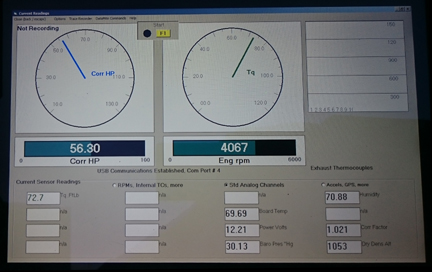 BELOW: Following run-in, this image shows the dynamometer's display screen showing corrected horsepower developed - a bit over 56 bhp at about 4100 RPM, which is a tiny bit more than the official stock specification (55 bhp at 4400).