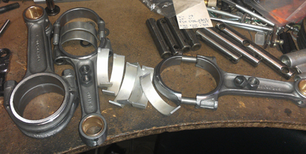 and inspect the rods - reject any that have been through traumaAT RIGHT: The rods having their bearing shells installed. Note how the tangs on the bearings are, when the tang end is up, on the left side. These are known as left hand tang rod bearings and are the mirror image of the younger type. Left hand tang bearings are no longer available - these came from my stash.