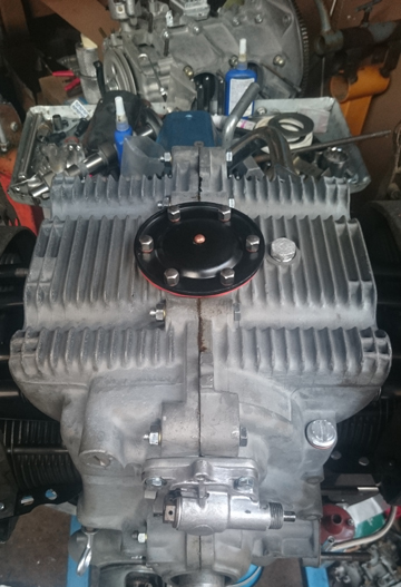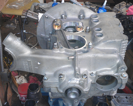EpilogueAs stated way up at the top, this engine was sold as a long-block to someone who had us tear it down, re-re-plate it with "alodine" (which accounts for the different shades of crankcase seen in these images), and then the re-reassemble it, of course. Here in the Epilogue section, you see the second incarnation of the long-block being assembled into a running-engine.
