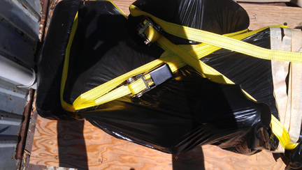 Now, to avoid loading troubles, the intermediate shipper who was running this over from Oakland to the San Francisco airport (SFO) brought his vehicle and set it in the parking area - a drop-gate VW double-cab, by the way. With the crate's base set on the back bed, we then set the engine on the base, and I strapped it in much as before. (Note that either strap could hold the engine down without the other - redundancy is just for safety.)