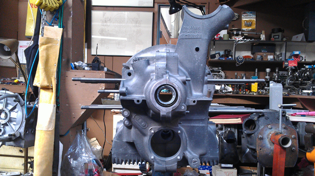 the pulley bore was repared, it was time to bore the crankcase itself. I gave