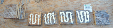 So, I secured a 1" thick sheet of plywood and made a new base. First, I took some OSB (oriented strand board - a plywood-like product) and cut a whole bunch of 4" squares, glued them, stacked them on top of each other and screwed them together to make 6 four inch cubes: