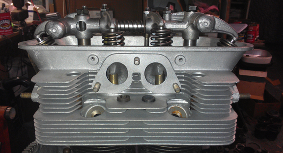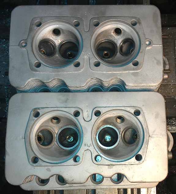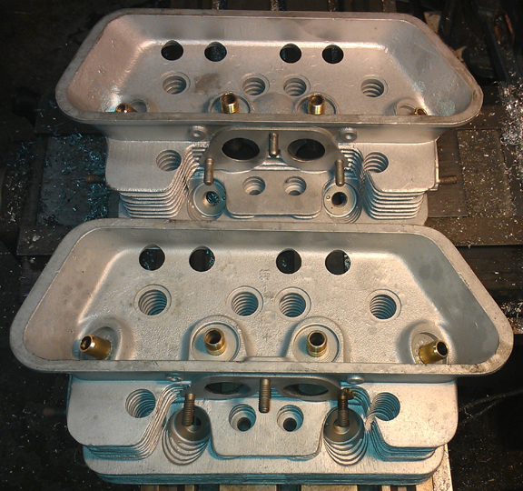 Not shown here, the heads were both later decked and fly-cut because to install seats, the heads have to be heated pretty high, but cannot be supported during that period and they can warp slightly. Decking ensures the cylinders are in the same plane. Then, the surface closest the crankcase gets cut down to match however much was taken out in cleaning up the cylinder sealing surface, thus ensuring the heads don't foul on the cylinder's top fin.