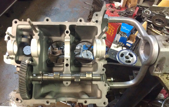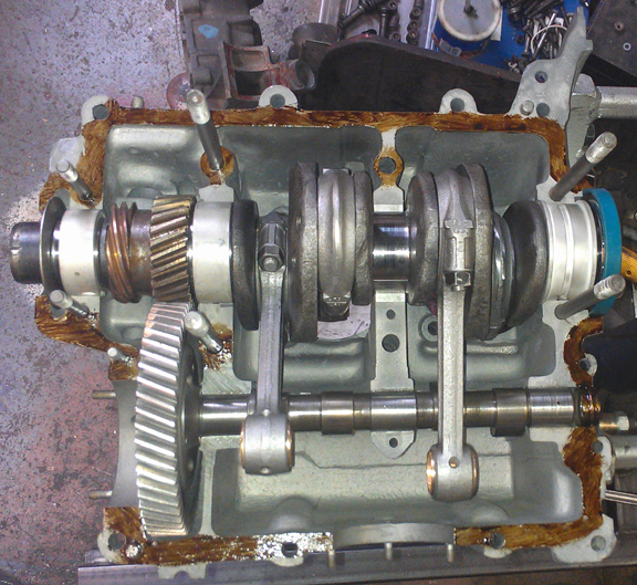 Crankcase preparation, described above, was a real chore. But assembly was a breeze! Here, the main bearings and cam are trial-fit.
