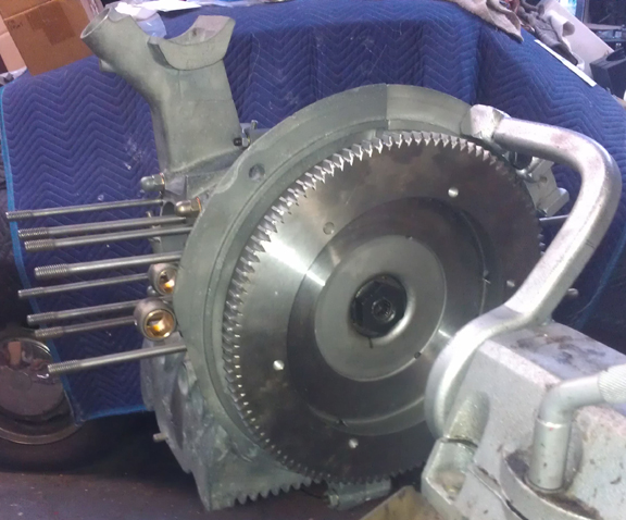 Somehow, I didn't get a photograph of the flywheel until it was already mounted! As I'd rather not take it back off just for its mug shot, I just took a shot of it mounted. What surprised me, though, was just how many attempts it took to get a good image that shows just how good this flywheel is. Most of the shots were blurry, or overly bright from reflection off of the recently refaced surfaces. Here's the image that passed muster: