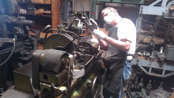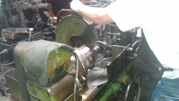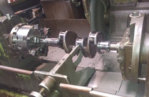 Thankfully, a friend of mine has a crankshaft grinder and we re-ground this one journal that was too large (see above) - bearing #2, also known as "the middle main." Now how many people are going to grind just ONE journal?! If that's what's needed, that's what we do. Here you can see that operation happening - first, intall the crank into the grinder and get the steady-rest (effectively a buck) up against the crank, so it won't flex while grinding: