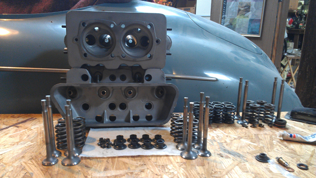 This engine's heads are here about to be assembled. The heads have all new guides and didn't need fly-cutting or other machine work.A couple of the exhaust studs have already been replaced. As noted above, the valves have been cleaned, refaced, and polished, though in this image they look a little dull. The retainers and keepers are new - hey, we ran out of used "B" type, amazing as that seems! (Thanks Stoddard!) (And what happened to the ones we took off?! -shrug- That's what spare parts stock is for, I guess.)