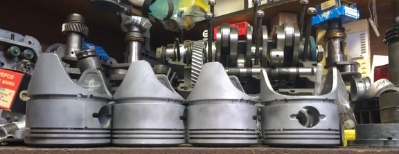 Super pistons can be positively identified by the fact that all normal pistons have a flat crown and all Super pistons are not flat. The bore is 82.5, of course, and these are long-skirt style as it's a plain-bearing, non-counterweighted crankshaft. These have three 2mm compression rings and one 5mm oil control ring. Oh, of course, we allways match pistons to cylinders and match piston weights as a set before installation.