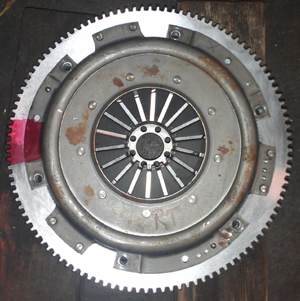 1) An "upgrade" to a 200mm clutch. This flywheel has been trued, ground on the friction face, then ground on the pressure plate mounting surface to keep the depth correct, and then balanced. Then, the C / SC era pressure plate was afixed with dowels (in their stock bores), and the whole assembly balanced to within a "gnatt's ass."