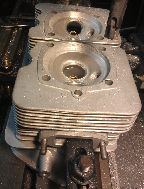 In the process of replacing valve seats, the head has to be heated while not attached to its cylinder and so they can warp slightly. So, after replacing valve seats, it's a good idea to "deck" the heads to ensure the cylinder sealing surfaces are in the same plane. And, as the heads have a relatively unknown history, it seemed prudent to deck both sides. You can see that process happening in the image at right. Following this, the surface closest to the cylinders is "flycut" to match the depth cut out at the cylinder sealing surface to prevent the head from contacting the cylinders on the shoulder of the top fin - that would prevent a good seal.