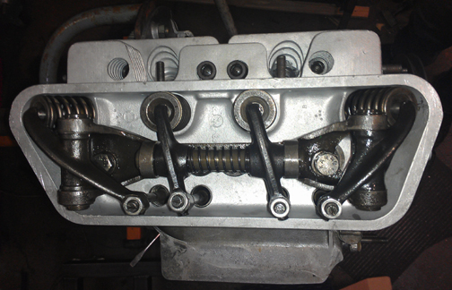 However, we did take the time to set the rocker stand height so the adjustment screws are in the middle of their range, and you can see that in this next image. What you can't see so well is that this engine has installed the correct pushrods, of "dual type" construction, aluminum and steel, as appropriate for 616/12 engines. But you can see reasonably well the white paint "stripes" on the intake springs (in both cases, just slightly left of center) - this type of marking is found on new springs and usually washes away into the oil after being degraded by hot oil splash.