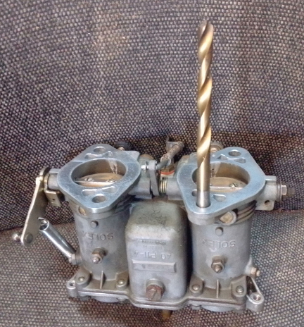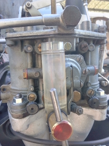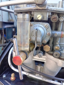 We ignored the powder and instead installed our new jet size and also a Solex float-bowl sight-glass, then focused on throttle linkage.