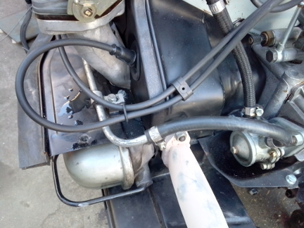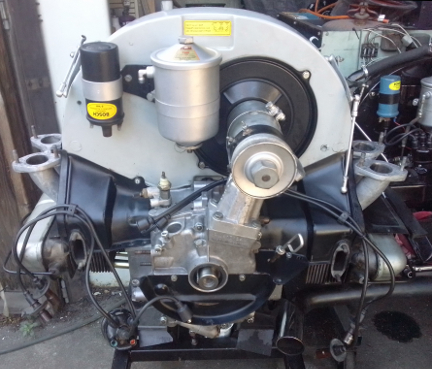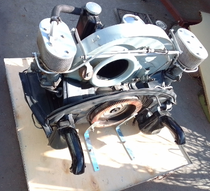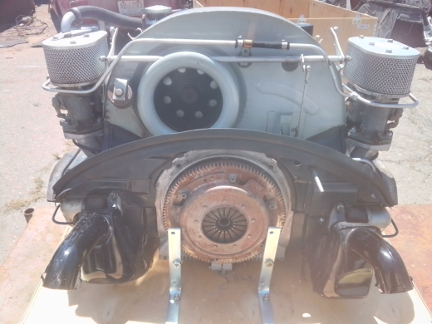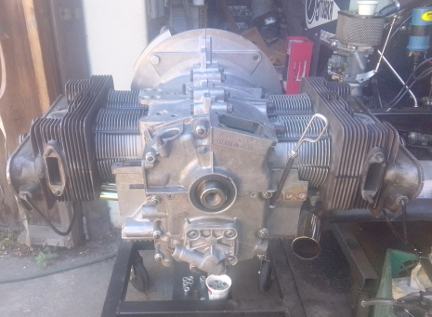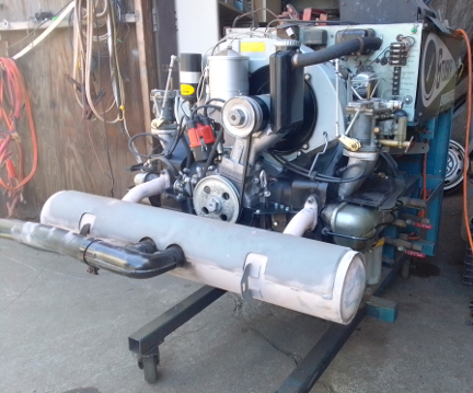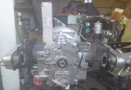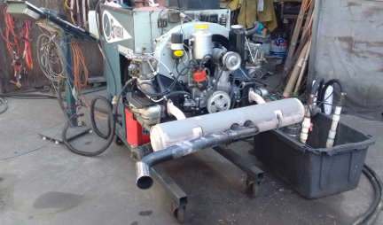 At right about this point, there were multiple of us in the workshop so an ideal time to shuffle a 912 engine off the dynamometer and this one onto it, and clear the running-space where the dynamometer usually sits when in service, and along the way the flywheel and clutch had to be installed. Unfortunately, we were so distracted, we didn't get any images of the setting of flywheel end-play, clutch installation, etc. But once the engine was on the dyno, as can be seen below, we promptly installed the loaner muffler.