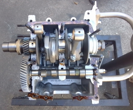 We also see here, better in the close-up at right, how the lifters are simply missing for cylinder 2 and yes, the pushrod is riding directly on the camshaft right now! But then, it's aided by gravety.