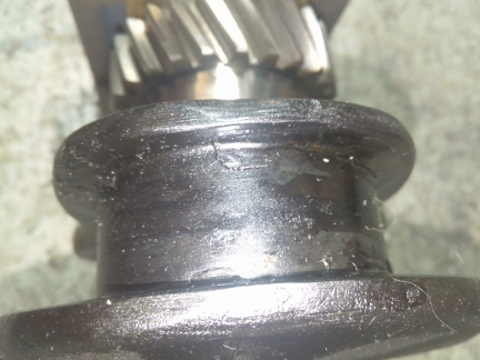 BELOW: Unfortunately, the damage to the crank is hard to capture in photographs, however, here we've tried our best. The blackness is actually metal! The rod bearing apparently melted into the rod journal, blending the two. Unfortunately, the crank was bent more than a little and is likely cracked, so rather than investing a substantial chunk of the cost of a new one only to possibly discover it's junk, we just replaced it. That gear (seen the right image), however, we reused on the new crank, of course!