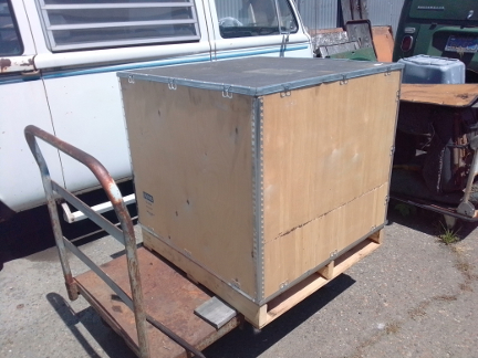 BELOW: Crated, waiting for pickup from a shipping company.
