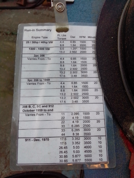 We follow the directions Porsche thoughtfully provided in the workshop manuals. The proper procedure for this engine type is documented in the later 356 B/C Workshop Manual, operations 52 EN, 53 EN, and 54 EN, pages E83 and E84. And, yes, we have a cheat-sheet we use so we don't have to pull the manuals out every time we run-in an engine - it's seen below.