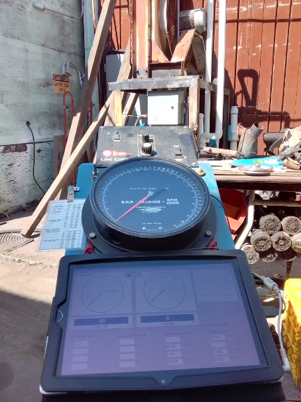 The black hose foreground left is the water feed hose. The amount of water coming through this hose is governed by the load control system, starting with a box that's hard to see in the image at left because it's in sunlight, directly above the dial on the control stand. This box has an RPM signal and an input from the operator and gives a signal indicating more, less, or the same amount of water to another computerized box that's mounted to the radiator stand. The red hose at left, is the output of hot water from the engine brake to the catch basin. The green hose is the brake's vent to atmosphere - it may spit water now and then. The two black hoses on the right edge of the image at right are the water return hoses coming from a sump pump that's under the control of the operator via a switched outlet on the control side ("front") of the dyno. On the control stand (facing the viewer on the right edge of left image and, facing away on the left edge of the right image), there's also a weather station, and a display computer that we'll see an image of below.