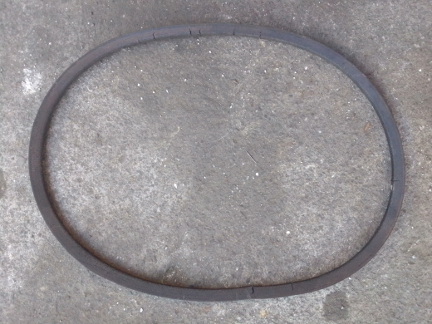 BELOW LEFT & RIGHT: After years of the generator stand to T-6 type filler / breather gasket NOT being provided, we were delighted to see it now in the modern gasket sets. Unfortunately, it's the wrong size on the outside, as we discovered after installing it. So, we trimmed it back with a razor, as seen here. (Note on the lower edge where the sealant is still on the gasket; that area all has to be cut off!) And, of course, we stock the original fan belts - the new one is the exact same type as the old one! Note the pulley is now the correct four-hole unit!