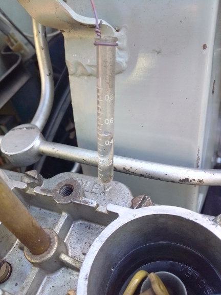 AT RIGHT: Taking a photo of this was harder than it might seem as the contrast of the background is a problem as is paralax and distortion caused by the glass itself showing the fuel level a little differently depending on the paralax - viewing angle. However, here we can see the injection quantity (two pumps) is above 0.4 ml and below 0.5 ml, which is perfect for the present conditions.