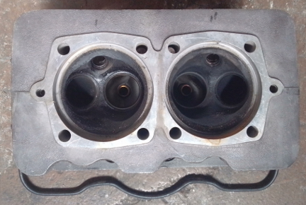 AT RIGHT: This head had been on the right side, for cylinders 1 and 2. Note the dark colors of the valve seats; they're coated with carbon, indicating that combustion occurred while the valves were open. (See text for more on that.) We re-ground the seats for a good sealing surface.