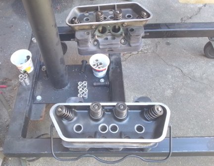 BELOW, LEFT & RIGHT: We're always snapping images and most of the ones we took of this process were washed out via too much light! However, these were OK. At left, the heads, waiting to be installed, set upon the lower portion of the engine stand. At right, the heads now mounted on the assembly as it was after the cylinders had been mounted. Perhaps notable is that the blackening of the heads can be seen to be robust within the rocker-box area of the heads but a bit faded out on the rest of the head. This fading is usually due to the rough actions of simply cleaning the heads performed by previous mechanics. However, in our case, we try very hard NOT to contribute to this kind of fading, primarly by avoiding unnecessary cleaning, and when necessary to clean, doing so in a very gentle way.